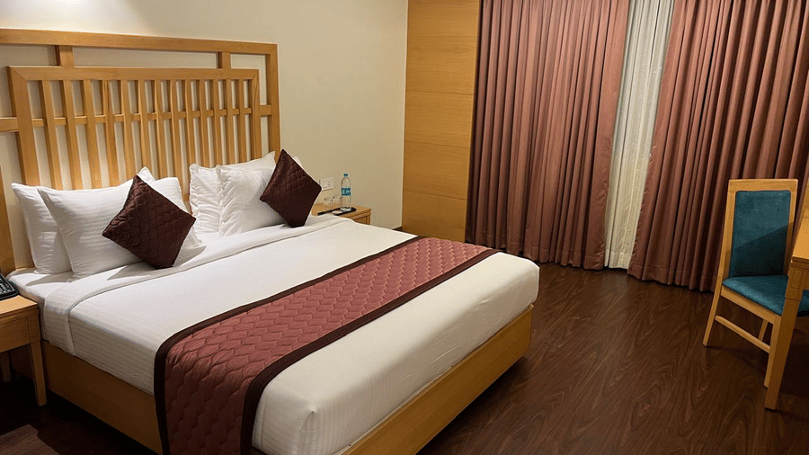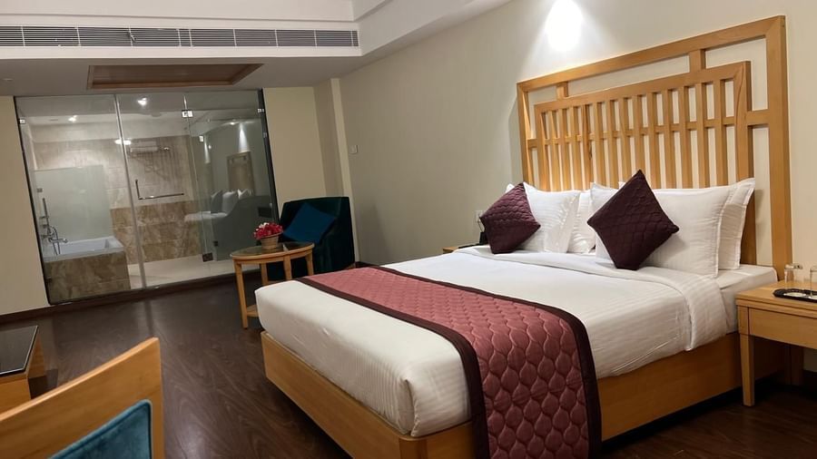 Ascend to the pinnacle of luxury at MM Legacy's Presidential Suite in Kanchipuram. This expansive 463 sq. ft. sanctuary is not just a room, it's an experience. It features a living room with a dining table, sofa, and television, providing the perfect space for hosting intimate gatherings or indulging in quiet contemplation. The lavish bathroom boasts a rejuvenating bathtub, inviting you to soak away your worries. Sink into the unparalleled comfort of premium bedding, and let the air-conditioning whisk away the Kanchipuram heat.